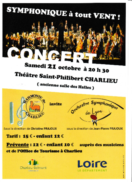 L’orchestre Symphonique de Lyon est heureux d’avoir accepté l’invitation de l’harmonie de CHARLIEU pour un concert en plusieurs parties dont une partie commune avec les musiciens de charlieu.